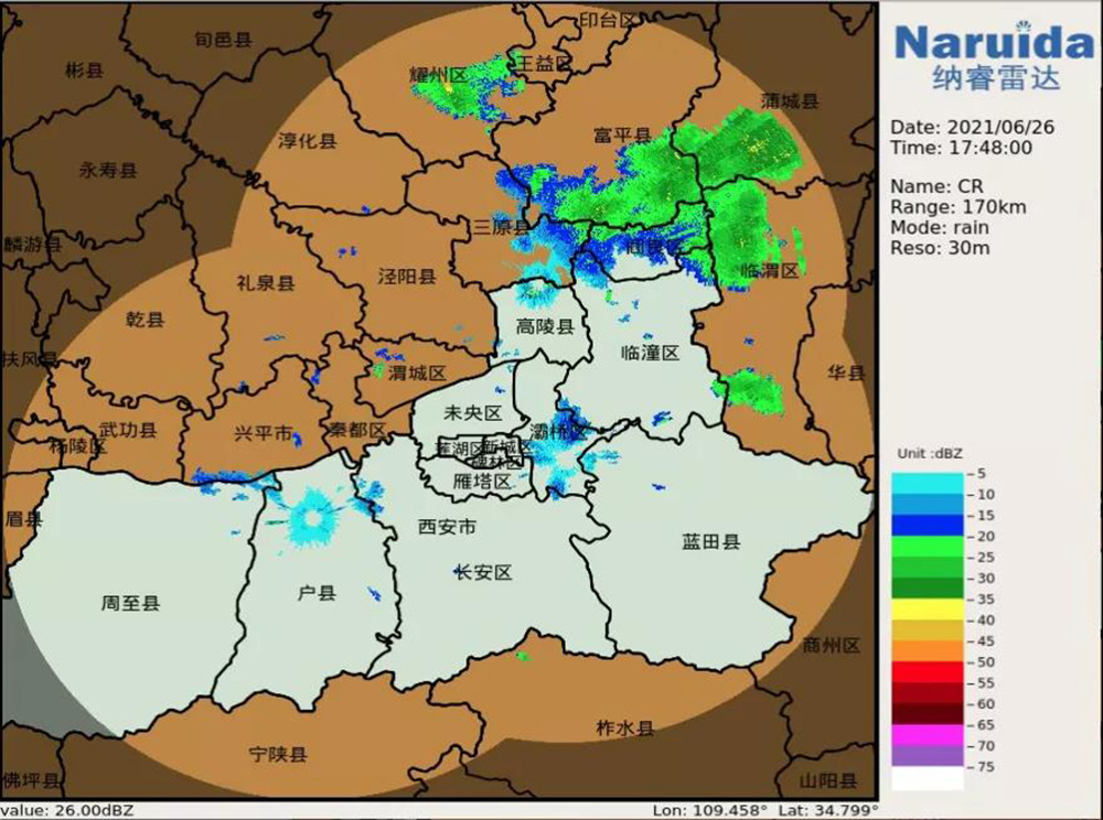 该项目由纳睿雷达自主研发的3部X波段双极化有源相控阵雷达组成,雷达观测数据空间分辨率达30m*30m,时间分辨率达60s,空间分辨率提高64倍,时间分辨率提高6倍,可提供基于双极化相控阵雷达的强天气监测、强天气预警、短临天气预报等一系列精细化气象服务解决方案。下一步,它还将与西安地区现有的多普勒天气雷达、L波段探空雷达、微波辐射计、面雨量雷达、云系降水潜力激光雷达、Ka波段测云仪、云雷达、大气电场仪等组成三维立体气象探测网络,为大气结构变化研究和中尺度天气预警提供有效的监测资料,为周边地区暴雨等强天气监测、预报和预警提供支撑。