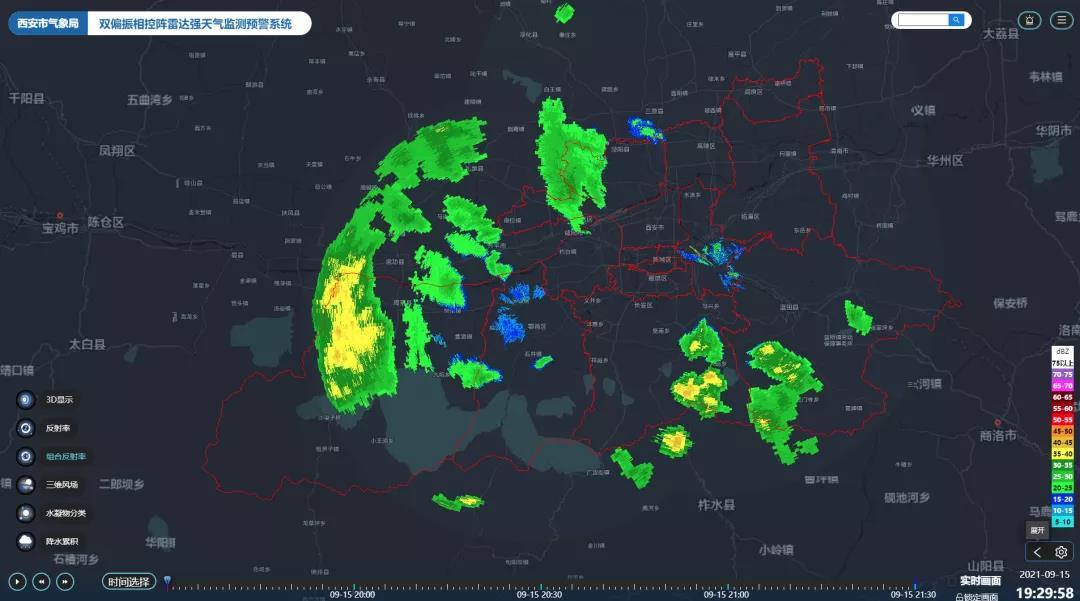 9月15日早晨,考验陕西气象监测网实力的时刻到了。根据长程业务雷达反馈的大范围天气监测情况,有一片降水云系正经过兰州,以每小时30—40公里速度往西安方向移动。