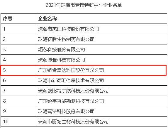 11月3日,珠海市工业和信息化局对外公布了“2021年珠海市专精特新中小企业”名单65家。广东纳睿雷达科技股份有限公司(以下简称:纳睿雷达)作为国内知名的雷达系统解决方案提供商和广东省高新技术企业,凭借在雷达设计制造、雷达软件生态和雷达数据服务等多方面优势,荣获“2021年珠海市专精特新中小企业”殊荣。