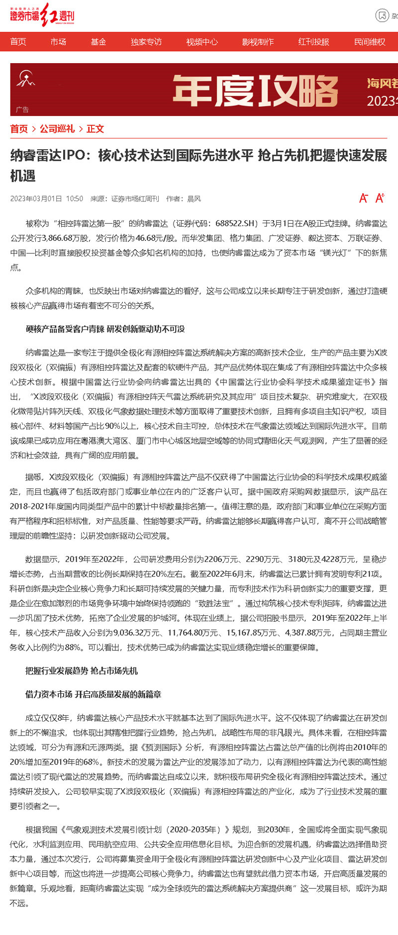 纳睿雷达IPO:核心技术达到国际先进水平 抢占先机把握快速发展机遇