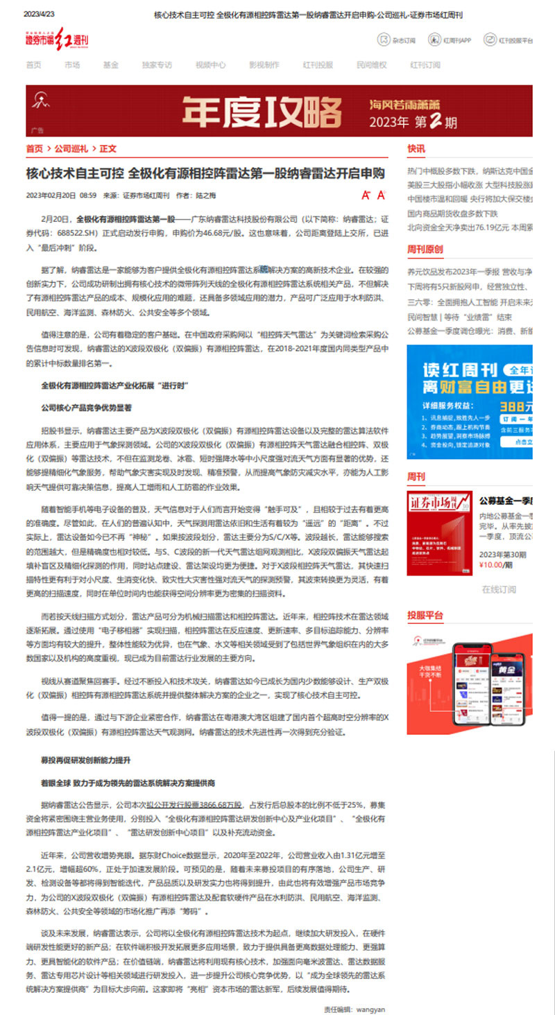 核心技术自主可控 全极化有源相控阵雷达第一股纳睿雷达开启申购