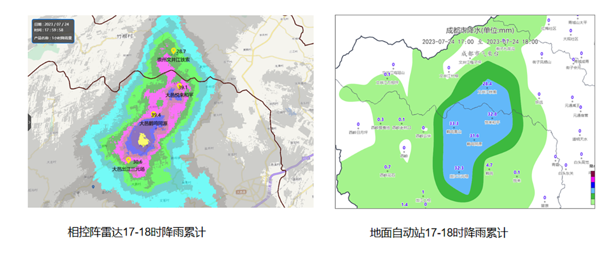 2023年7月24日下午17时至18时,正值大运会开幕前夕,成都市西部出现一次局地强降雨天气过程,强降雨中心主要在大邑县,自动站录得最大小时累积降雨33.3mm。这与该区域布设的X波段双极化有源相控阵天气雷达所探测的数据结果一致,分毫不差。这一高精度探测结果,给正驻扎在成都大运会气象保障服务一线的纳睿雷达团队带了极大的信心。经过几个月的精心调试与筹备,这一刻他们比以往任何时候都更加期待成都大运会的到来!